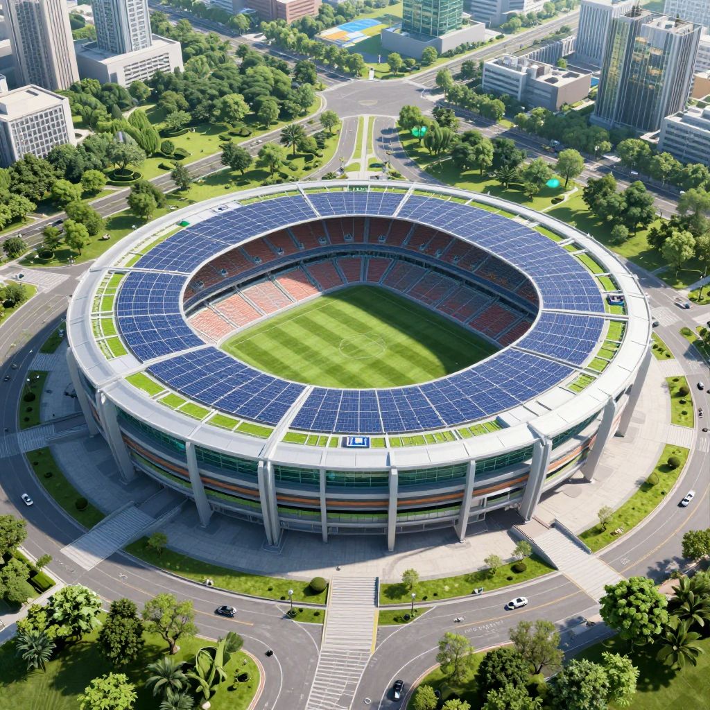 AI stadium generator visualizing an innovative eco-friendly stadium with sustainable materials, integrated solar panels, green terraces, AI-operated seating arrangements, surrounded by lush urban parks and smart infrastructure, photorealistic style with vibrant colors.