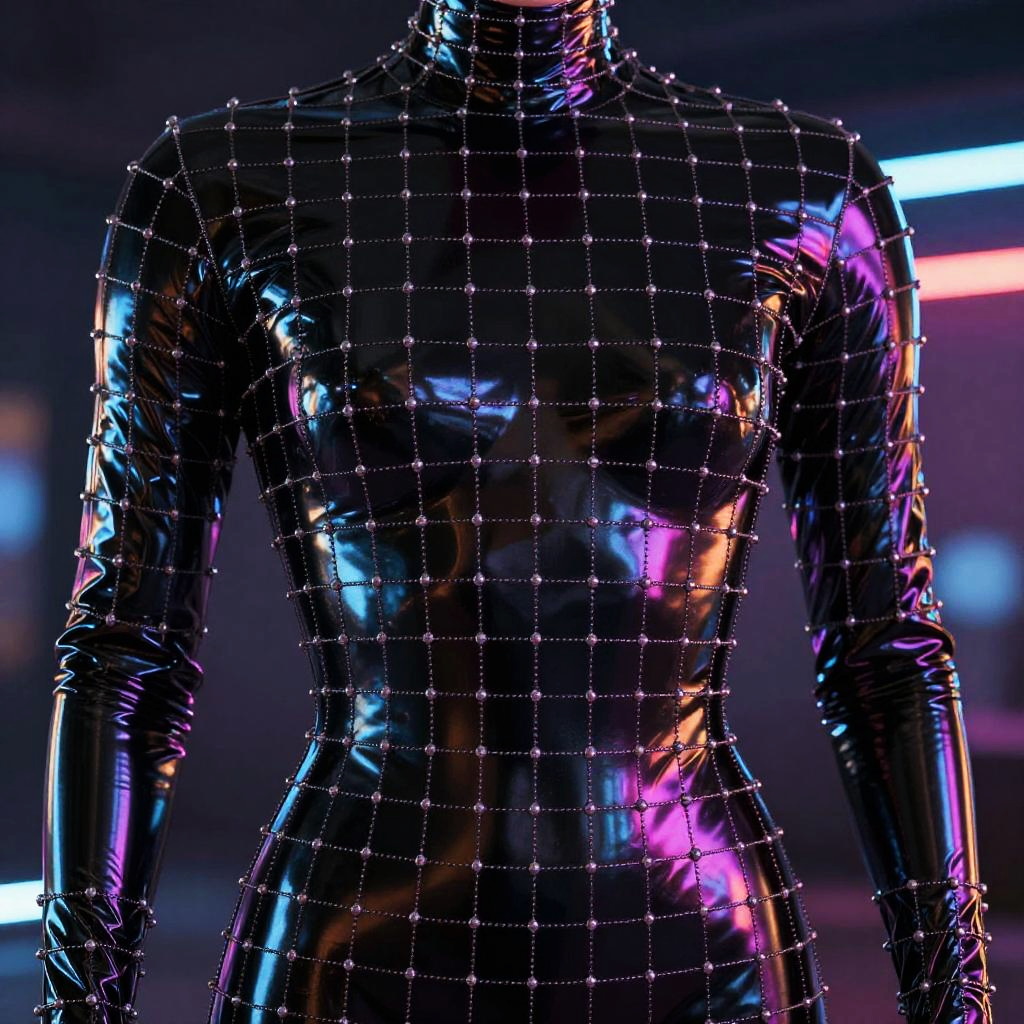 Latex grid mesh worn as avant-garde fashion, glossy black latex squares interconnected, sleek body suit, neon lights reflecting off surface, high detail, cyberpunk atmosphere