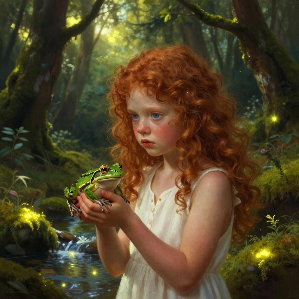 A digital painting of a young fair-skinned girl with curly red hair and blue eyes, wearing a white, sleeveless, V-neck top. She's holding a small green frog by a forest stream, surrounded by glowing, ethereal yellow light filtering through thick, mossy trees. Her expression is curious and slightly melancholic. The background is rich with detailed, mystical forest elements.