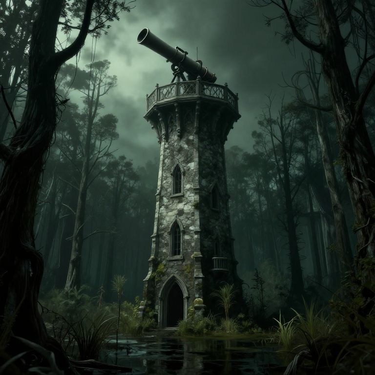 Gothic gothic fantasy, old stone high height tower in the middle swamp of a rotting forest, with big telescope on opened roof - Upscaled (Light) by,
