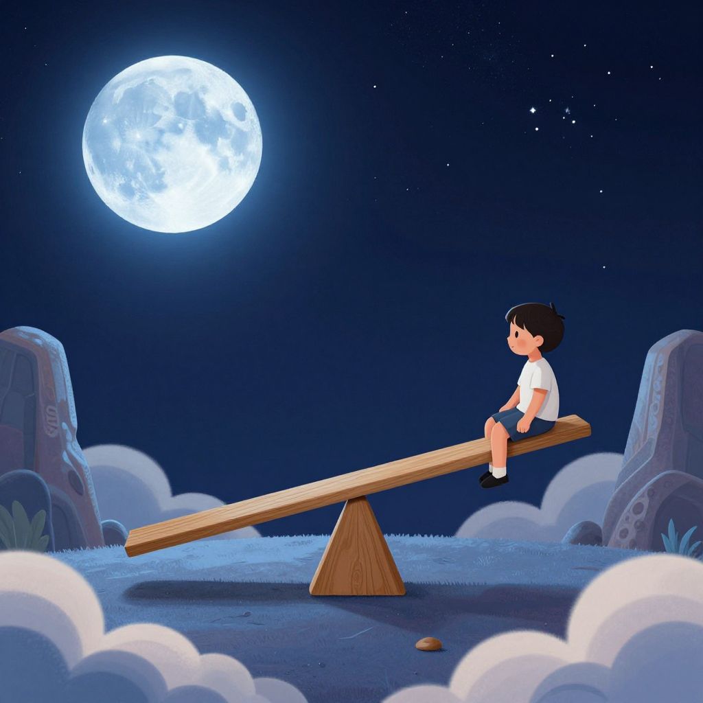 A whimsical digital illustration depicts a child sitting on a wooden seesaw, soaring toward a luminous blue moon against a starry night sky, with the other end of the seesaw disappearing into a surreal landscape of floating clouds and rocky formations, evoking a dreamlike, fantasy-inspired atmosphere.