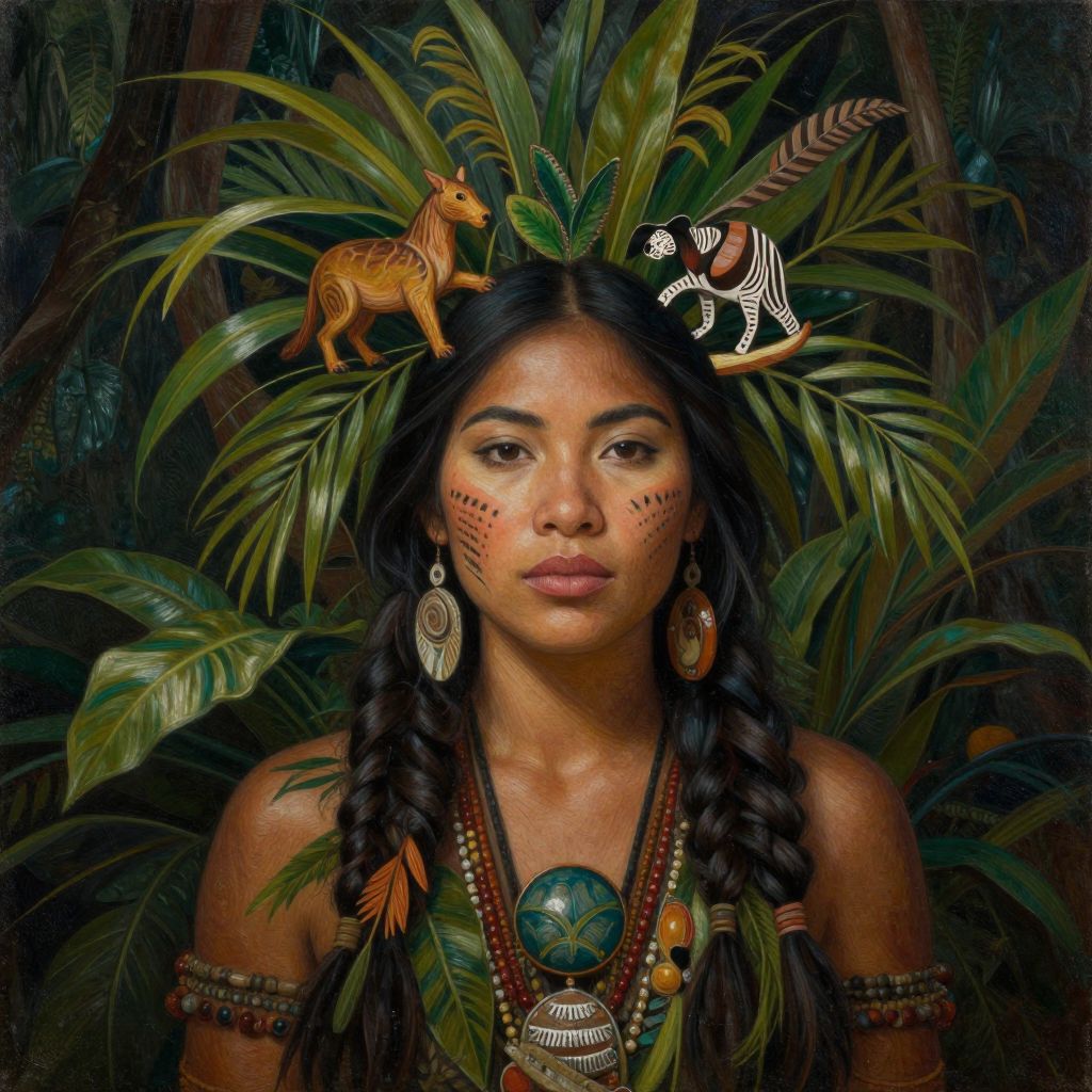 Digital artwork of an indigenous woman with dark hair in braids, adorned with animal figurines and leafy headdress, set against lush jungle foliage.