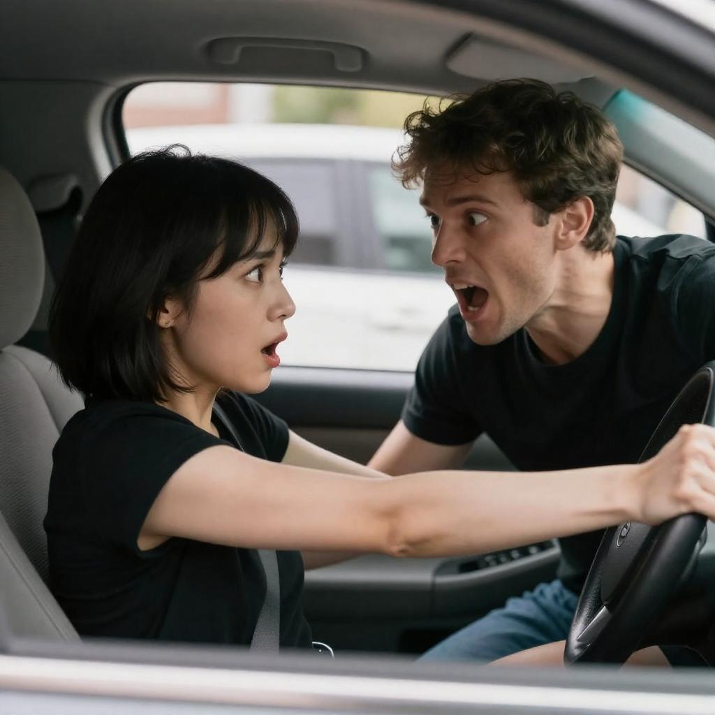 Photograph of a dramatic scene inside a car. A woman with short black hair, wearing a black top, has a shocked expression as a man with brown hair, wearing a black shirt, grabs her arm forcefully. Bright daylight outside contrasts with the car's interior. The man's mouth is open in a shout, and his eyes are wide with intensity.