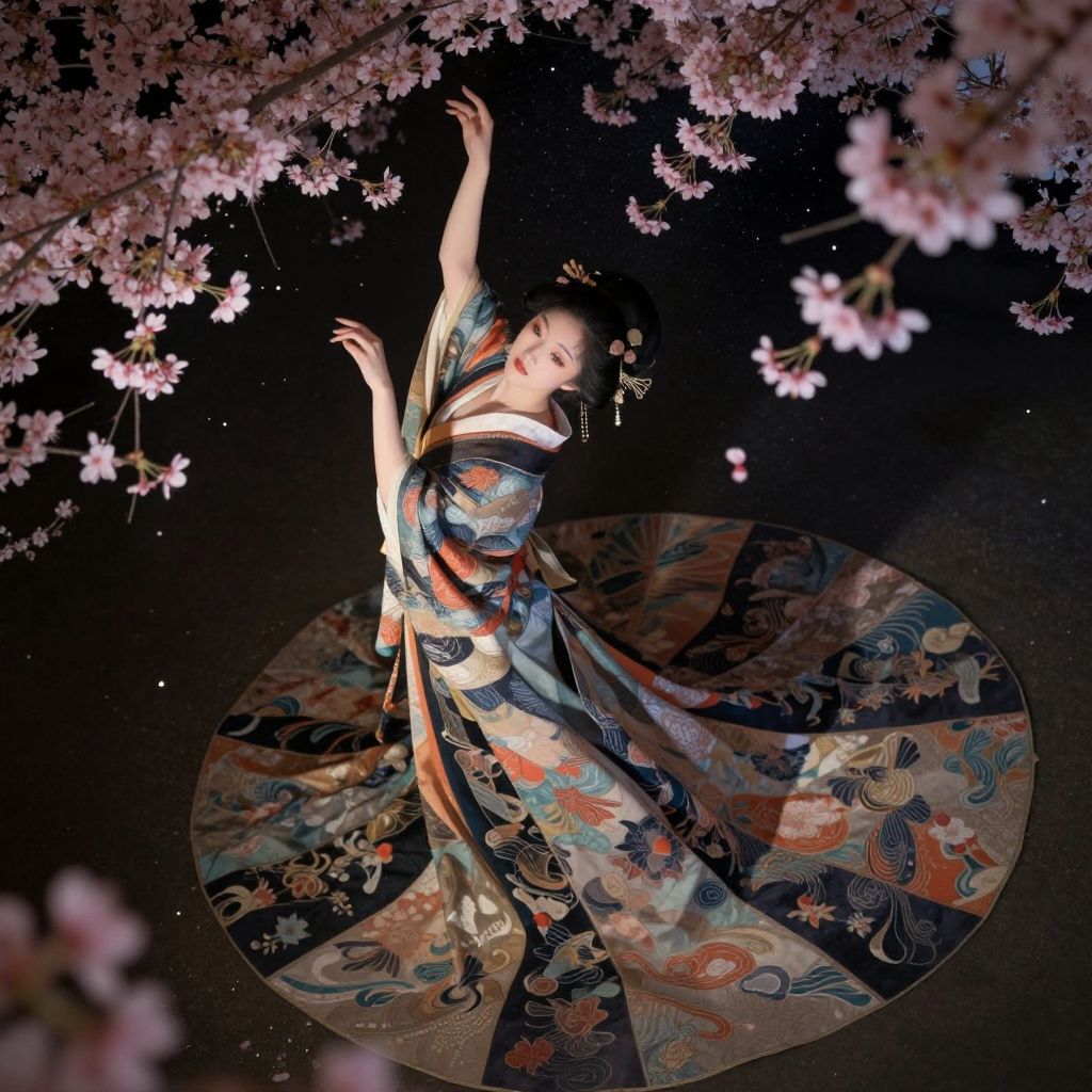 Photograph of a Japanese woman in a traditional kimono, standing under cherry blossom branches at night. She has fair skin, dark hair in an elegant updo, and wears a colorful kimono with intricate patterns in blue, orange, and gold. Her arms are gracefully raised, surrounded by pink cherry blossoms. The dark background contrasts with her illuminated figure and the patterned circular mat she stands on, which features elaborate designs. The lighting highlights her serene expression and the delicate texture of her kimono, creating a tranquil and romantic atmosphere.