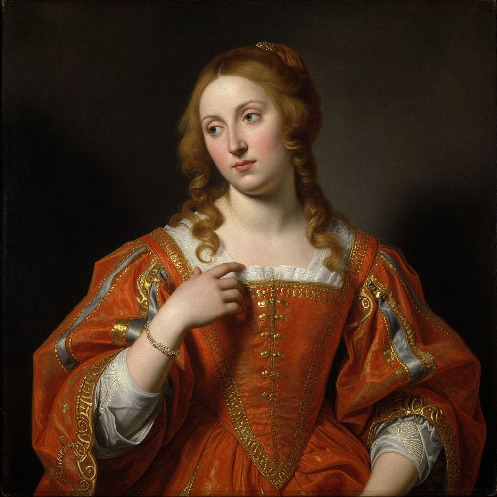 Renaissance portrait of a fair-skinned woman with curly red hair, wearing an ornate, red velvet dress with gold trim, white lace collar