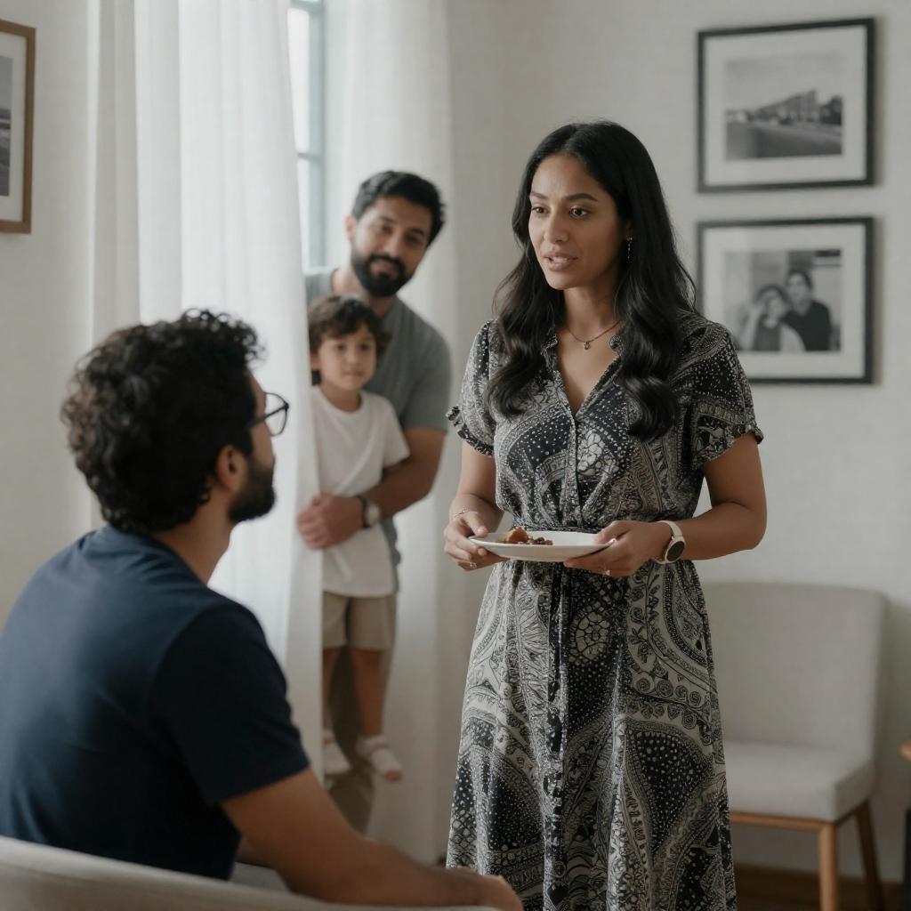 Indoor photo of a Middle Eastern man and woman sitting on a beige couch in a warm living room. The man has dark hair and a beard, wearing a black turtleneck and gray pants, looking attentively at the woman. The woman wears a light brown headscarf, green cardigan, and beige dress, smiling while holding a chocolate bar. A wooden cane rests between them. In the foreground, a coffee table holds a bowl, a cup, and a saucer. Dark green doors and wall shelves are visible in the background.