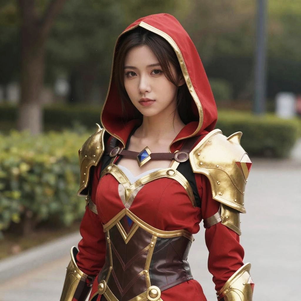Photograph of an Asian woman cosplaying as a fantasy warrior. She has fair skin, dark brown hair, and is wearing a red and gold armored outfit with a hood. Her gold shoulder and arm guards contrast with the red fabric. She stands outdoors in a blurred park setting with green bushes and trees in the background. Her expression is calm and confident.