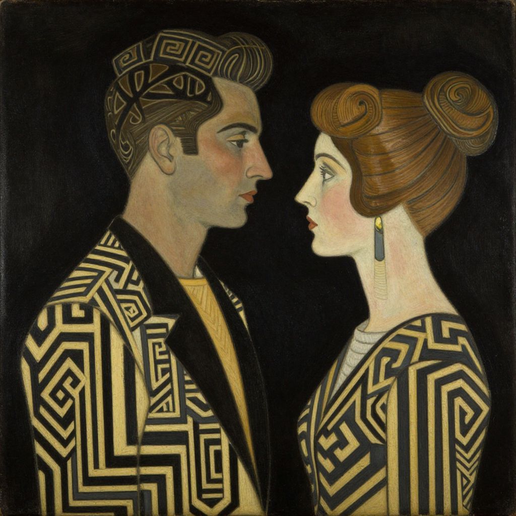 Art Deco-style painting of a man and woman in profile, facing each other, wearing black and gold geometric patterned clothing.