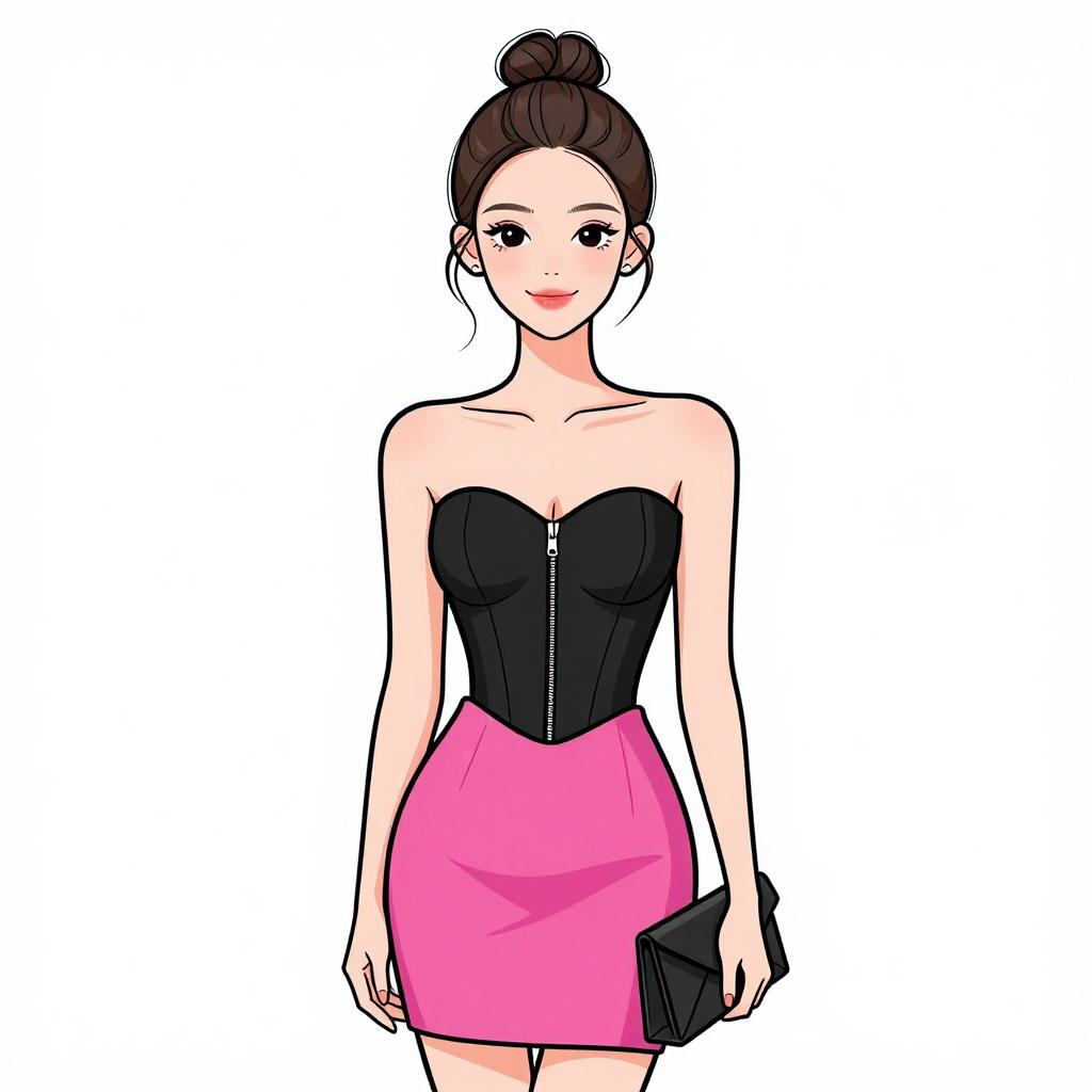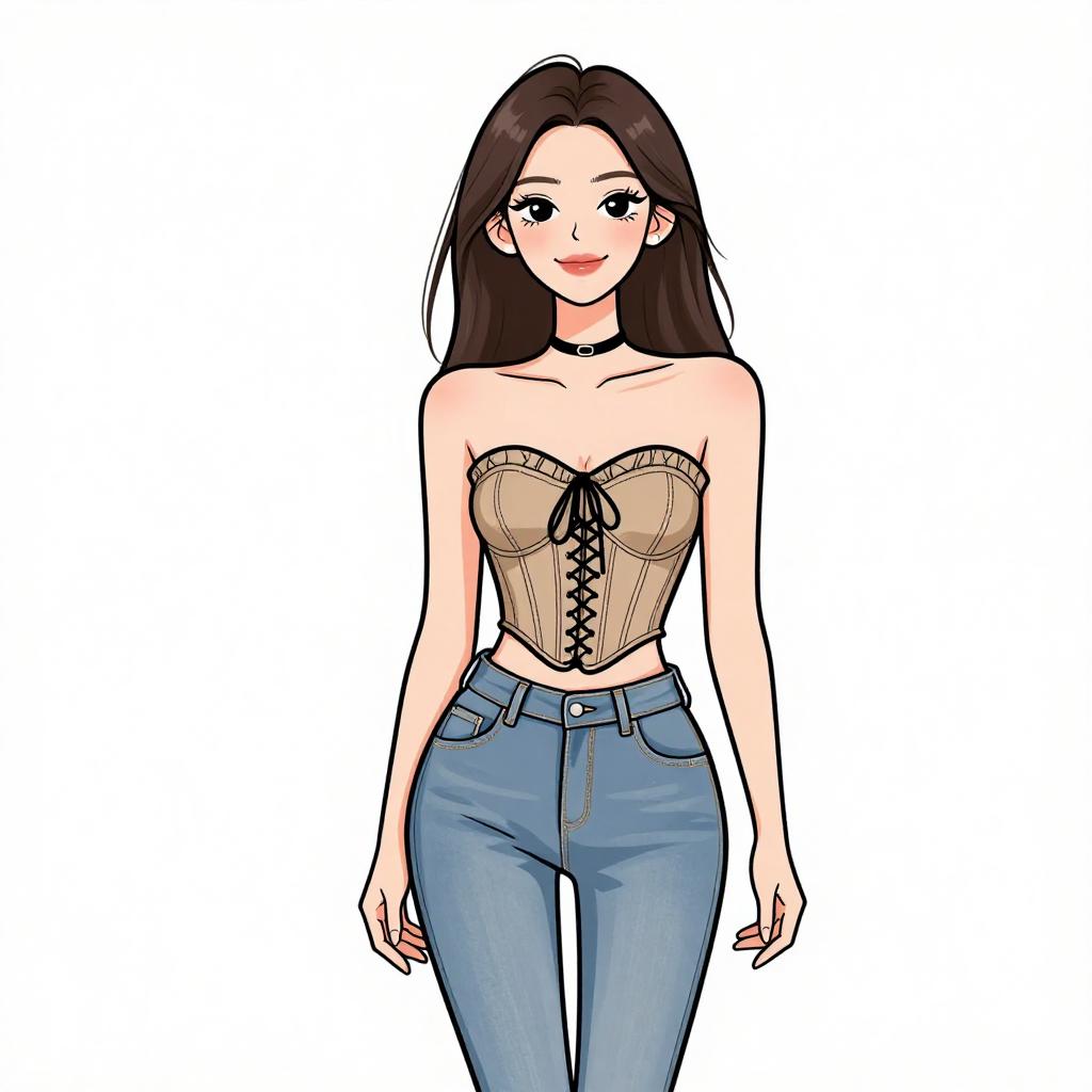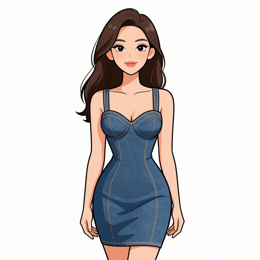 Woman with pretty face and pretty hair. smiling Woman, contemporary, denim bodycon dress, sweetheart neckline, thin shoulder straps, front corset-style lacing, seam detailing, knee-length, fitted silhouette, white background. --sref 1467