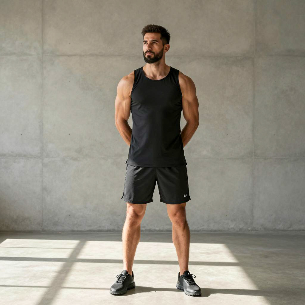 Halal gym clothes, photograph of muscular man standing, black sleeveless athletic dress, hands behind back, black shoes, short dark hair, beard, serious expression, sunlight casting shadows, concrete floor, beige concrete walls, modern minimalist setting, realistic style, medium shot