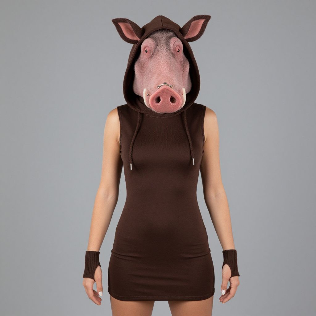 "Warthog Adult Costume, woman in a brown dress with a hoodie and a nose ring"