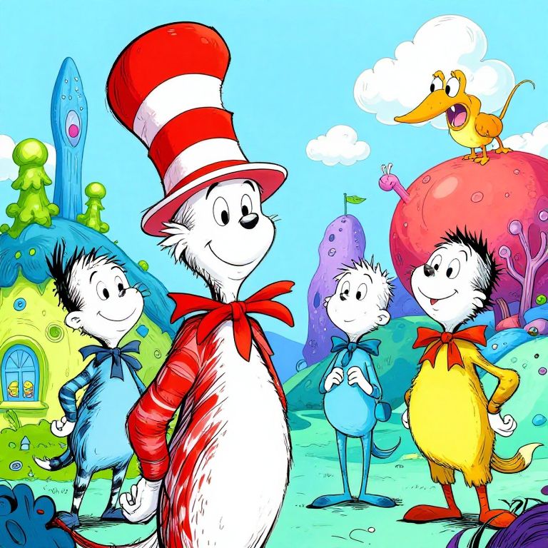 Dr. Seuss characters images, whimsical and colorful cartoon figures with exaggerated features, playful and imaginative settings, bold outlines and vibrant primary colors, surreal landscapes inspired by Seussian worlds, joyful and quirky expressions