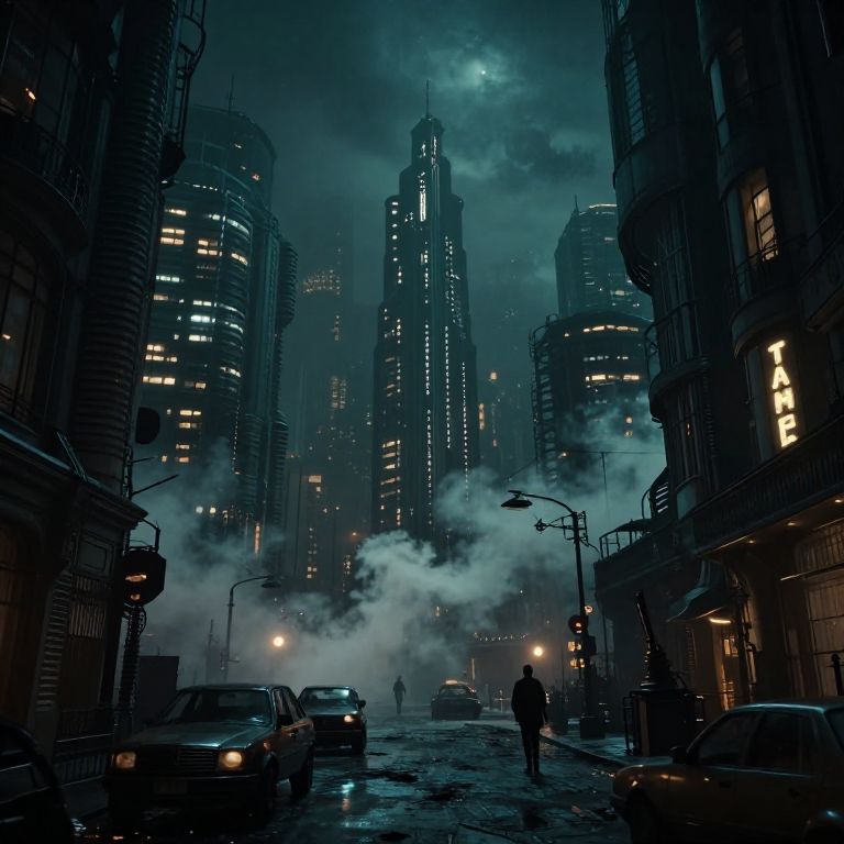 Popular Music dystopian gothic dieselpunk city at night, with smoke, grim future, film noir, cinematic,