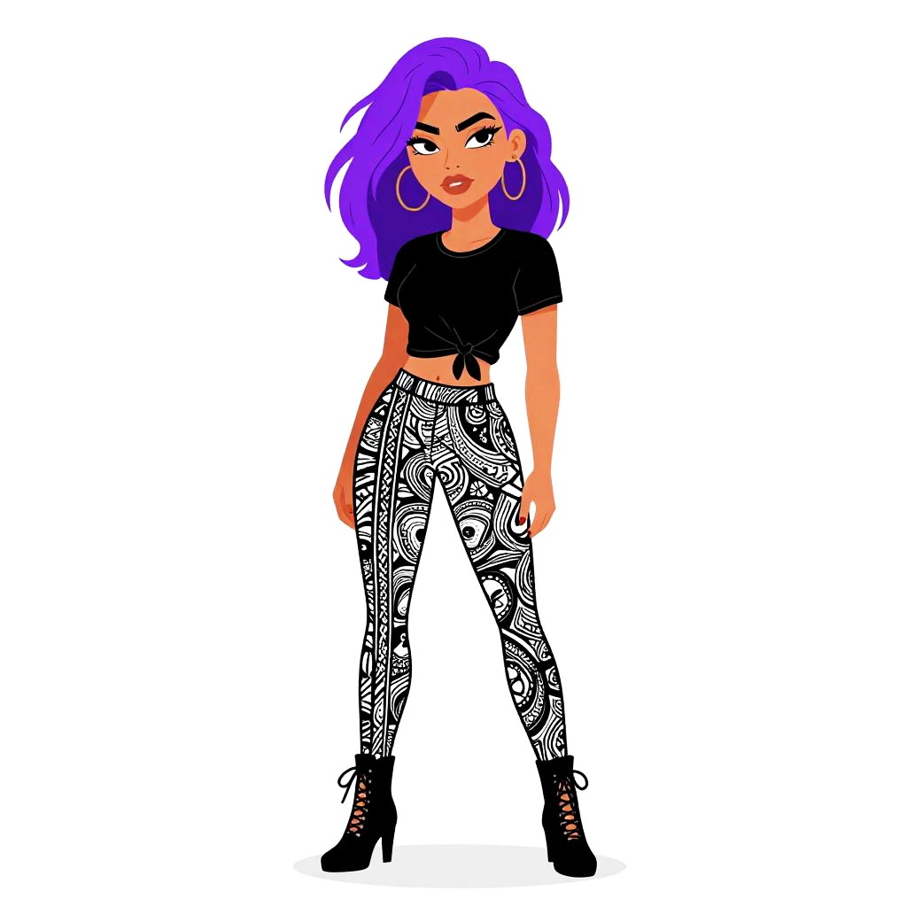 Woman with pretty face and pretty hair. Woman, casual boho, sleeveless tank top in cream with intricate black paisley and mandala print, scoop neckline, soft drape, black frayed denim shorts, gold fringe statement necklace, white wall background. --sref 1467
