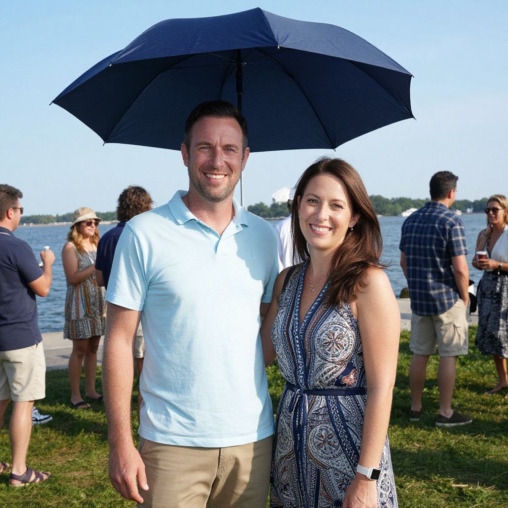 Photograph of a smiling couple standing outdoors under a black umbrella; man in light blue polo, woman in patterned dress, people and lake in background
