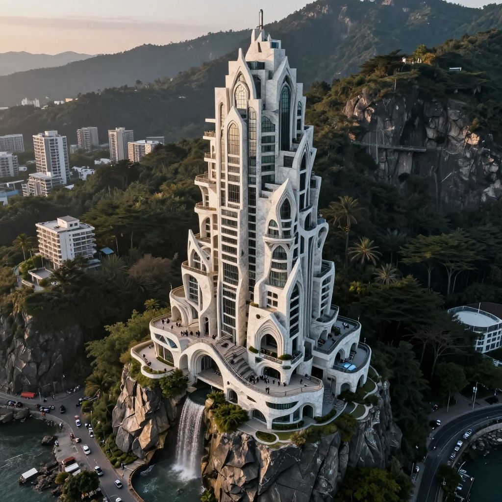 (Residential complex, high-end community, luxury, vacation use:1.4), (on a rocky coast, half embedded in the cliff, small waterfall:1.2), (architectural masterpiece, inspired by Lebbeus Woods, Jean Prouv, Neil Denari, Pierre Chareau:1.2), aerial view of an incredibly tall, enchanted renaissance tower made of white to grey limestone, surrounded by ominous woods, rock cliffs, dark fantasy, sunset, architecture, masterpiece, high detail, crisp focus, depth-of-field, (intricate details, best quality:1.4), (avant-garde, future, reality, science fiction, photorealistic), (modern architecture:1.2), (Large Files, Ultra Realistic, 8K, 16k, FHD, HD, VFX, Perfect, Photography, composition, Architecture Sales Photography, Architecture Competition, Ultra High Resolution, Cinematography, High Resolution Image:1.1), (dramatic lighting, direct sunlight, ray tracing, clear shadow:1.1), (magnificent, Abstract Expressionism but extremely beautiful:1.2), [:traffic|windows|railing|stair|balcony|terrace|crowd|Sidewalk|vehicle|trees|equipment| detailed signal_details:0.7], [:marble|granite|lbrick|tile|metal|concrete|glass|foliage_material texture:0.7], (real landscape:1.1), (blurred background:1.0), [buildings||trees||Crowd|buildings||trees||Crowd|buildings||trees||Crowd:0.7], (background, more_details:0.3), great lighting, clear, xtower, industrialbuilding, frames