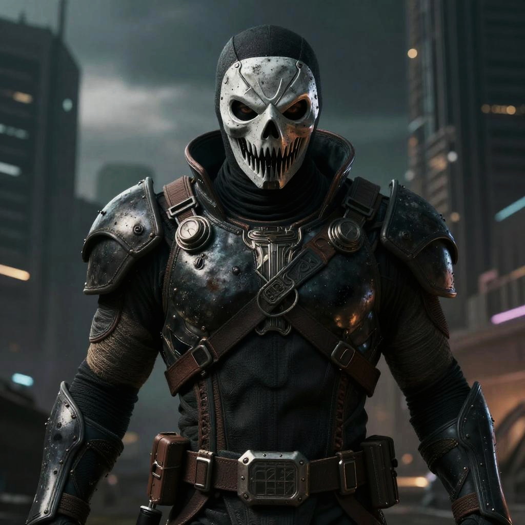 Digital artwork of a menacing, armored figure with a white skull mask, standing in a dark, neon-lit urban cityscape.