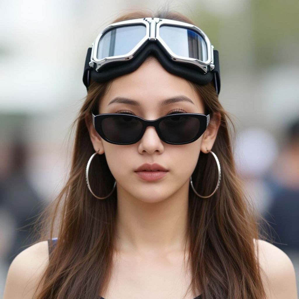 "woman pilot costume, 1girl, solo, goggles, realistic, goggles on head, uniform, military, looking at viewer, pilot, arms behind back, blurry, military uniform, blurry background, smile, lips, brown hair Realistic photo of casual sexy person with pretty face"