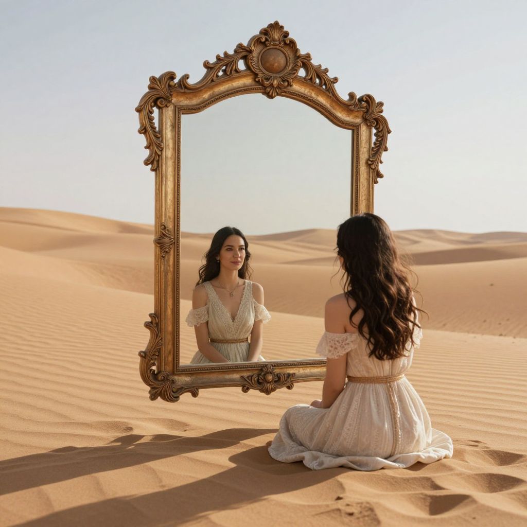 In a vast desert of shifting sands, a woman sits before an ornate mirror, her reflection suspended between reality and an ethereal void, where the mirror's frame seems to hold the weight of unseen worlds.