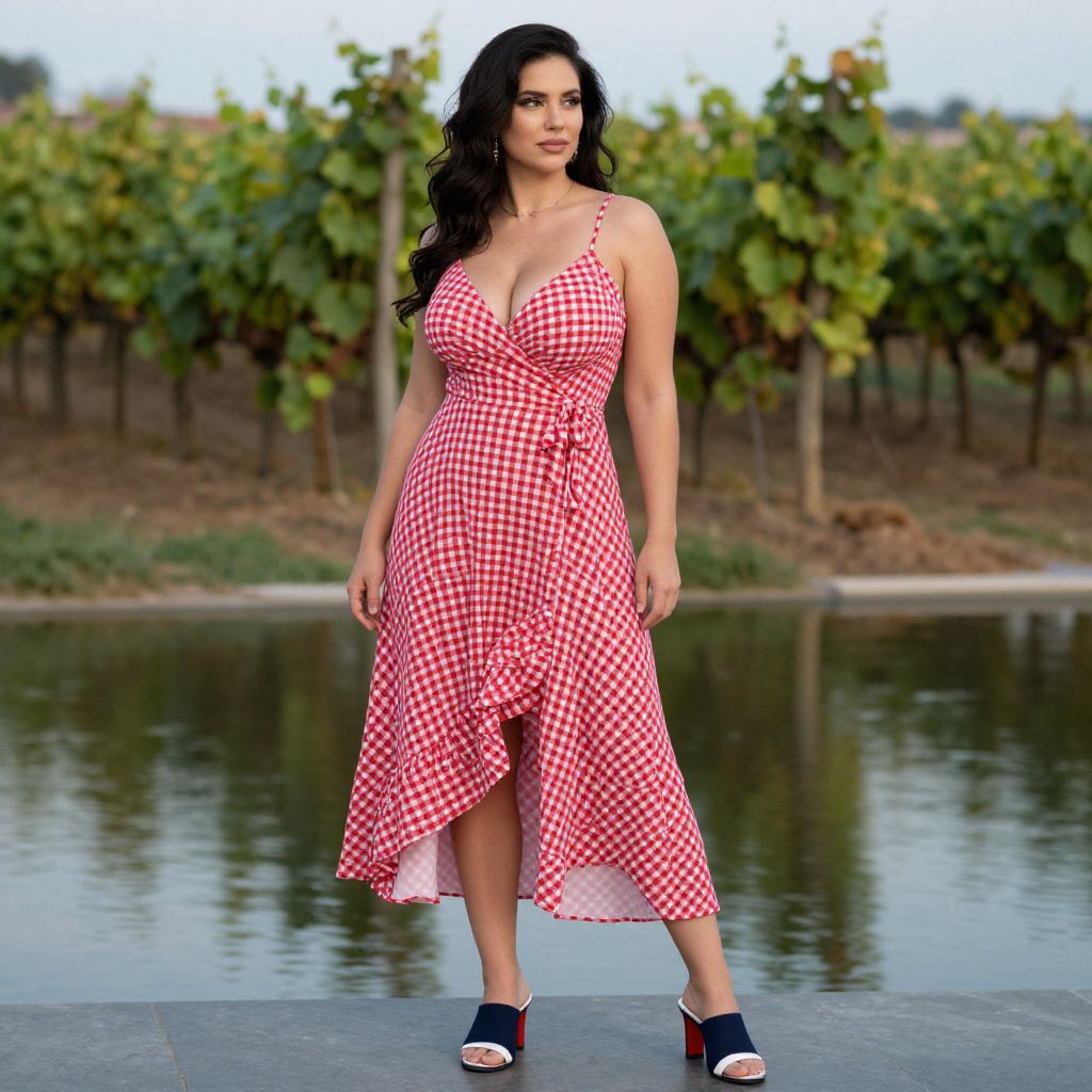 A Pear-shaped body type woman, casual summer, red and white gingham wrap dress, V-neckline, spaghetti straps, asymmetrical ruffled hem, navy blue open-toe mule sandals with white and red color blocks on heels, sprawling vineyard, Silky water effect, long exposure, serene landscape Sexy. Pretty face and beаutiful eyes. Big breasts