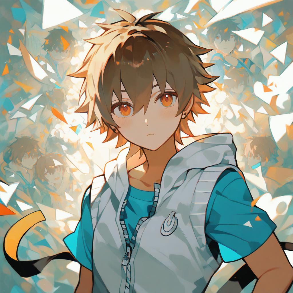 Digital anime-style illustration of a young boy with short brown hair and large orange eyes. He is wearing a blue short-sleeve t-shirt under a sleeveless white hoodie with the hood down. The artwork features soft shading and dynamic composition, capturing the character in a close-up angled pose.