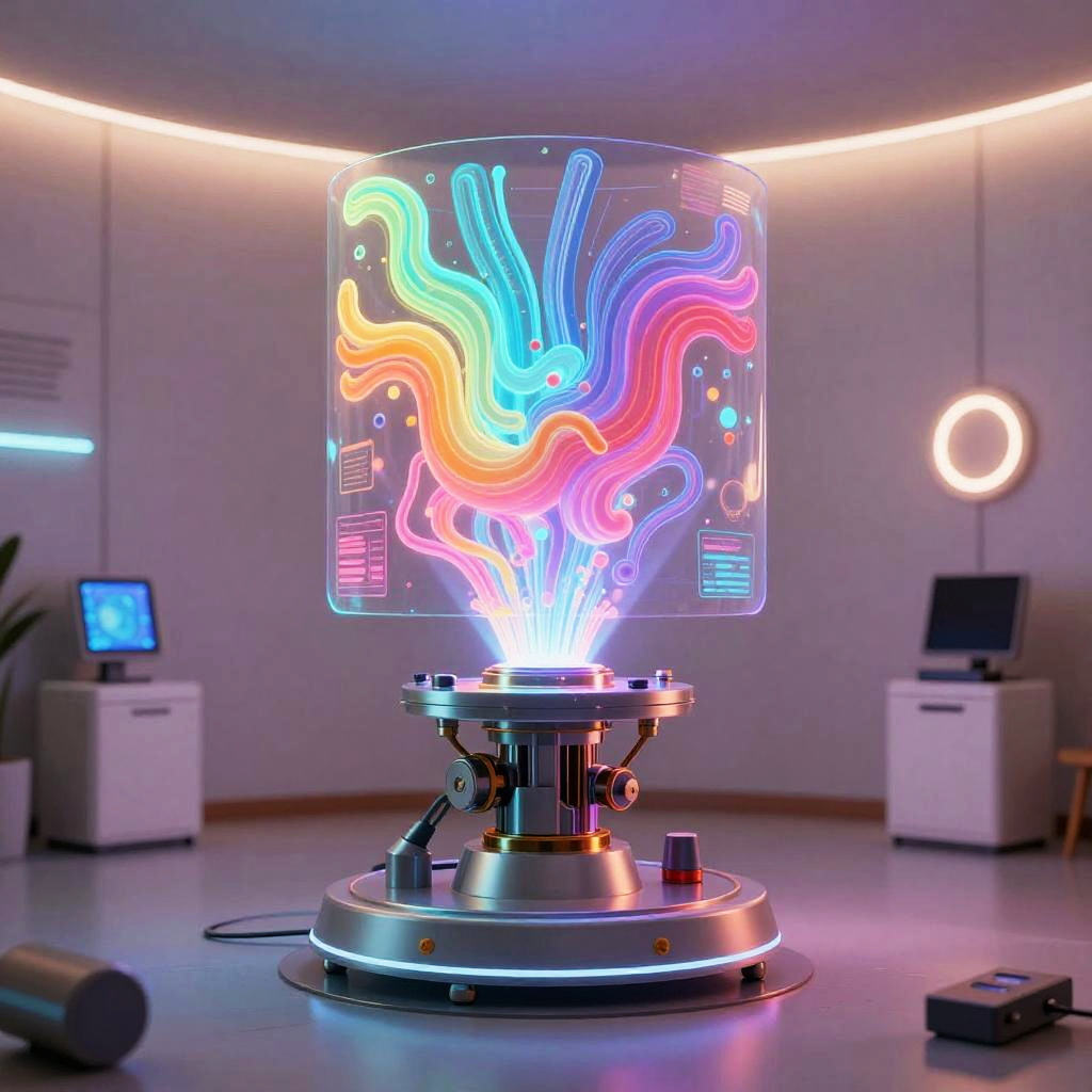 Dall e generator represented as an abstract mechanical device producing vivid dreamlike images through holographic projections, surrounded by futuristic gadgets and ambient lighting in a minimalistic high-tech room, vibrant color palette