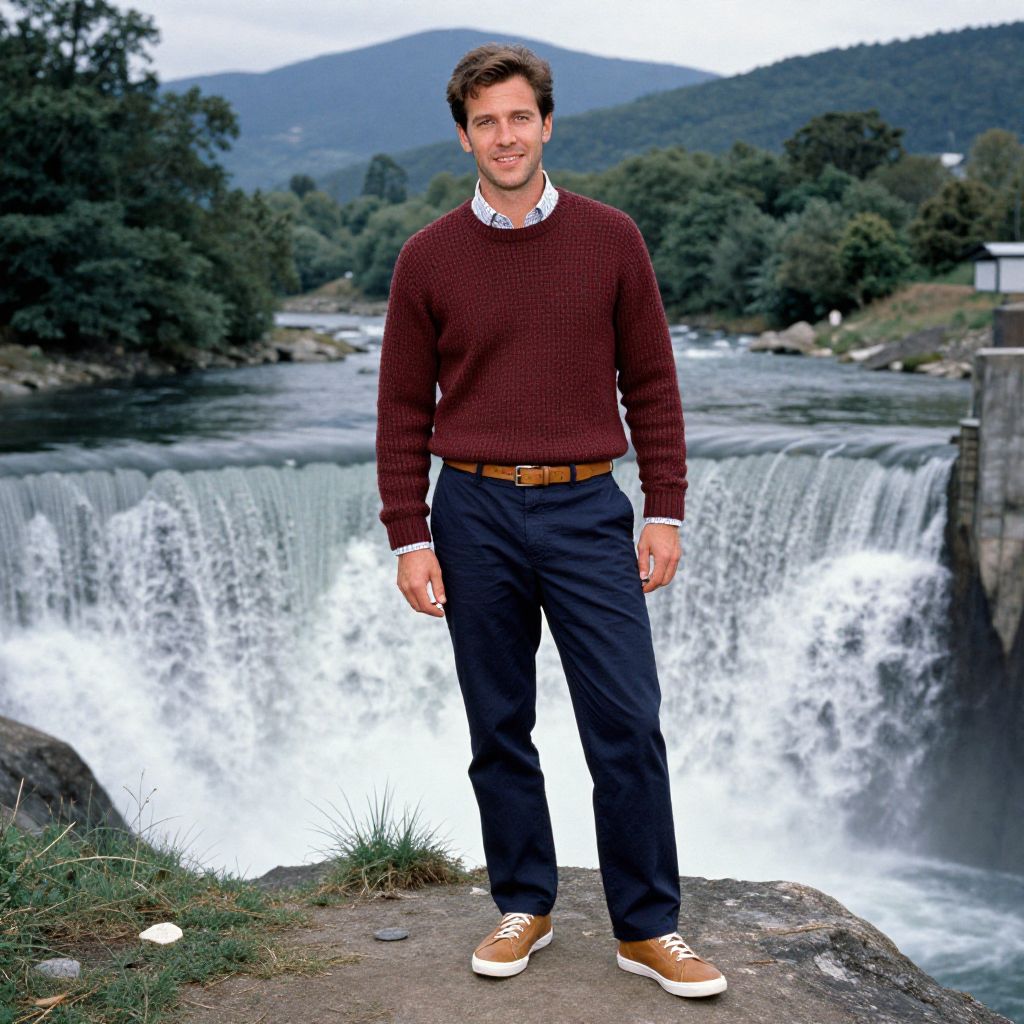 A man, burgundy knit sweater, navy blue chinos, tan leather sneakers, light plaid dress shirt, matching tan leather belt, hydroelectric dam cascading water, lush riverbanks, distant mountains, anscochrome analog film, relaxed smile, confident gaze. Man has masculine face and piercing eyes