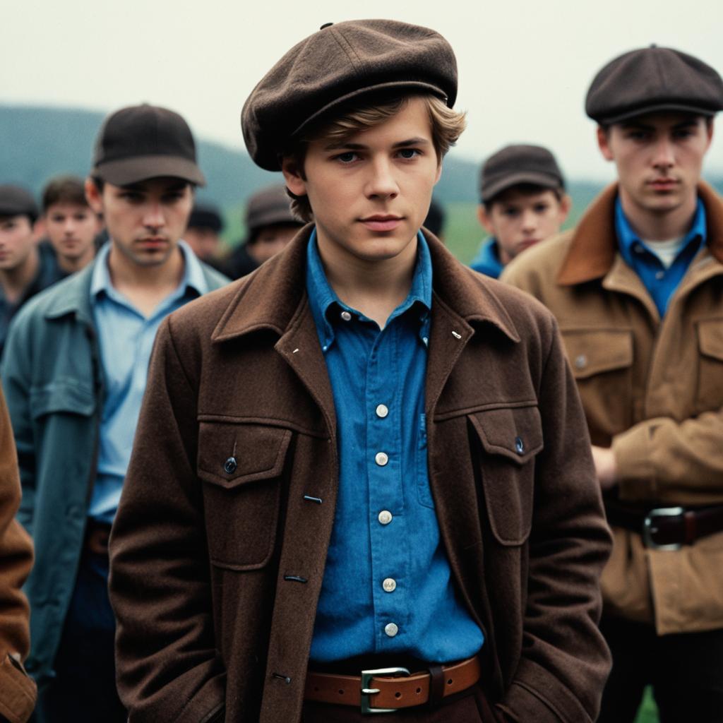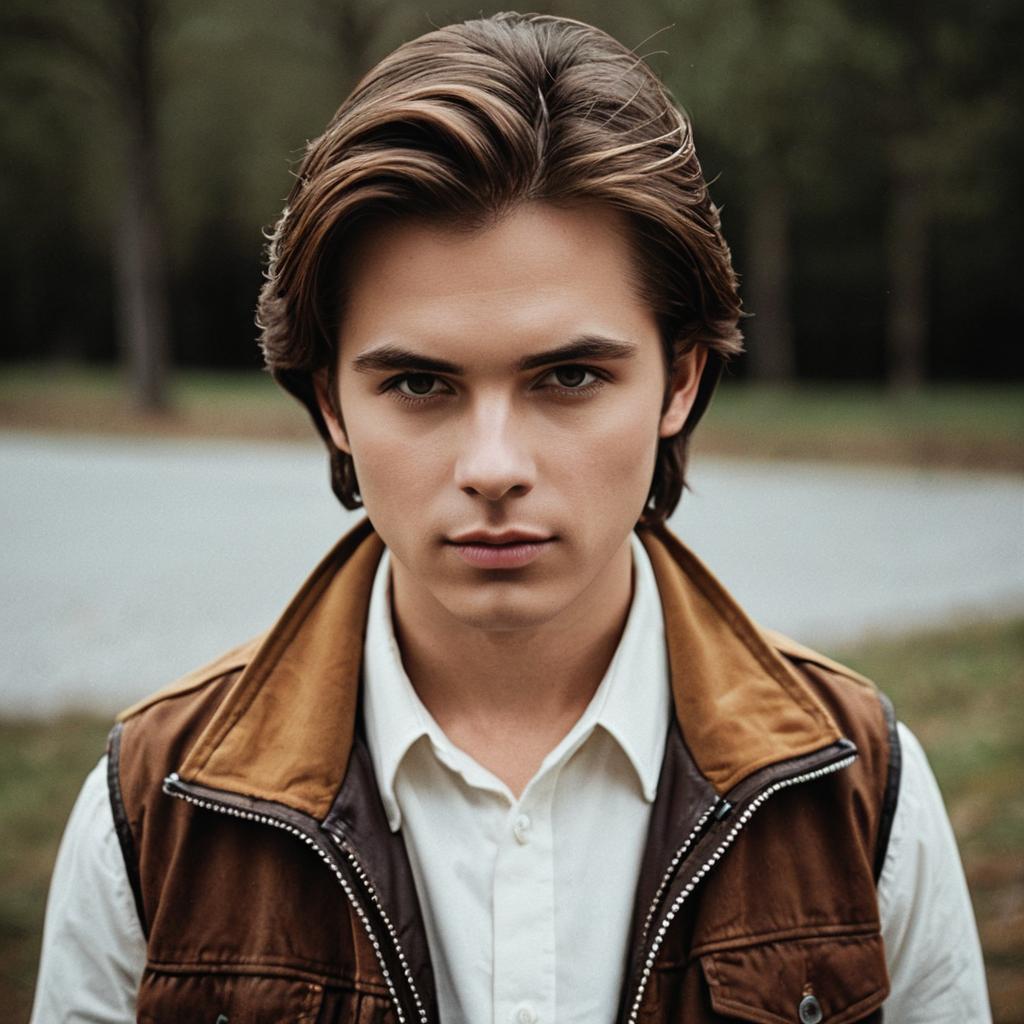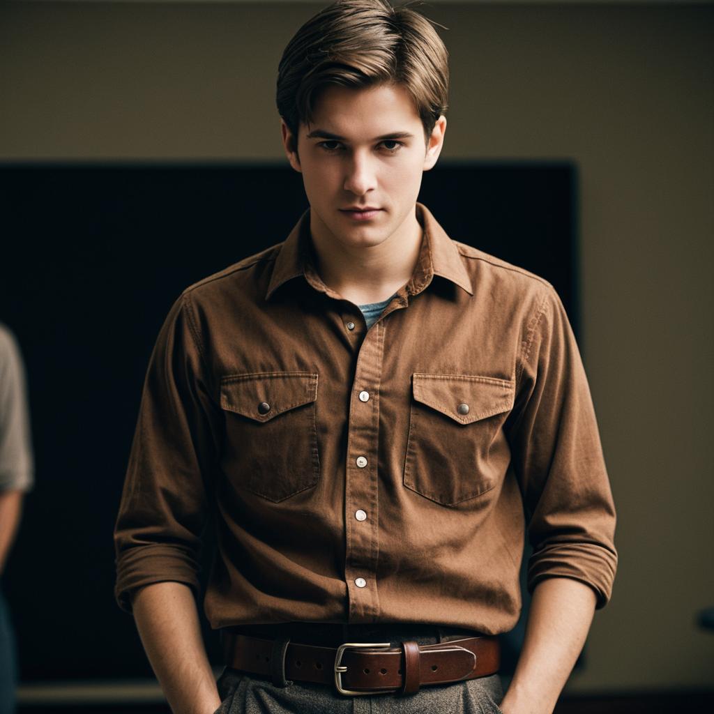 Hans solo outfit,realistic, male focus, belt, hat, 1boy, blue shirt, shirt, pants, solo focus, jacket, looking at viewer, multiple boys, standing, brown jacket, blurry, brown coat, long sleeves, coat, blurry background, closed mouth, collared shirt, brown headwear