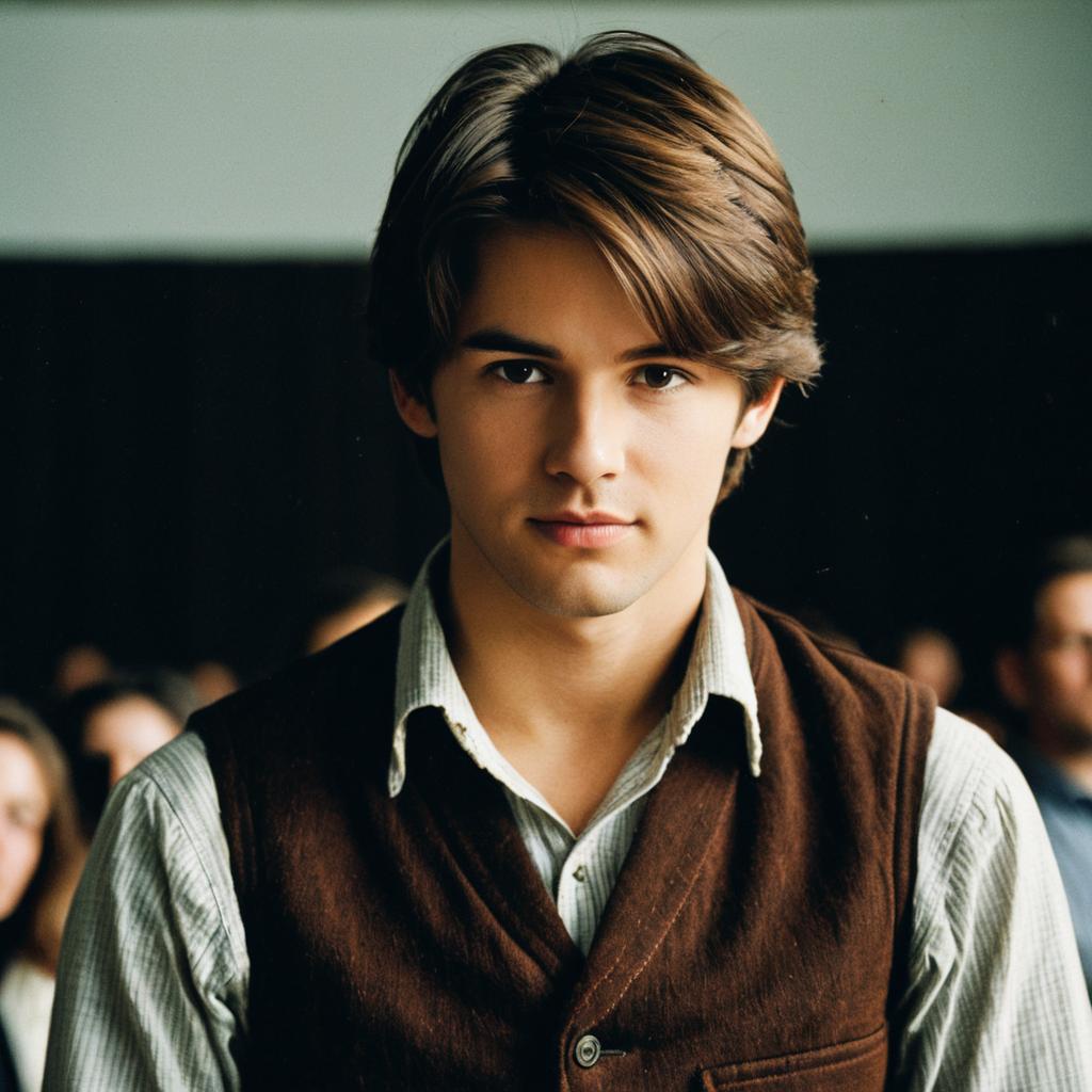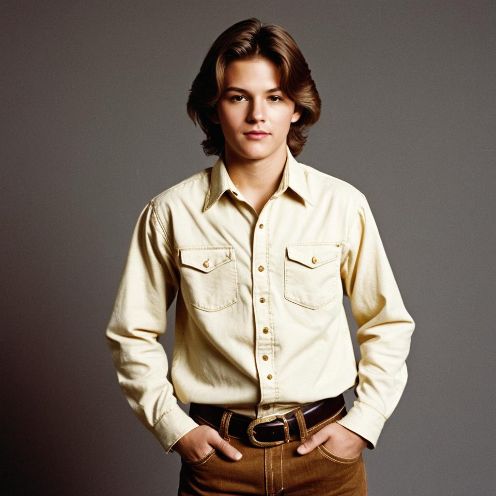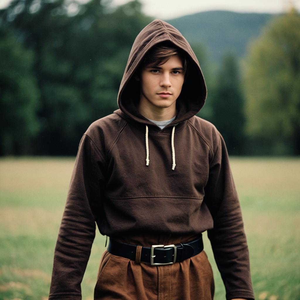Hans solo outfit,realistic, male focus, belt, hat, 1boy, blue shirt, shirt, pants, solo focus, jacket, looking at viewer, multiple boys, standing, brown jacket, blurry, brown coat, long sleeves, coat, blurry background, closed mouth, collared shirt, brown headwear
