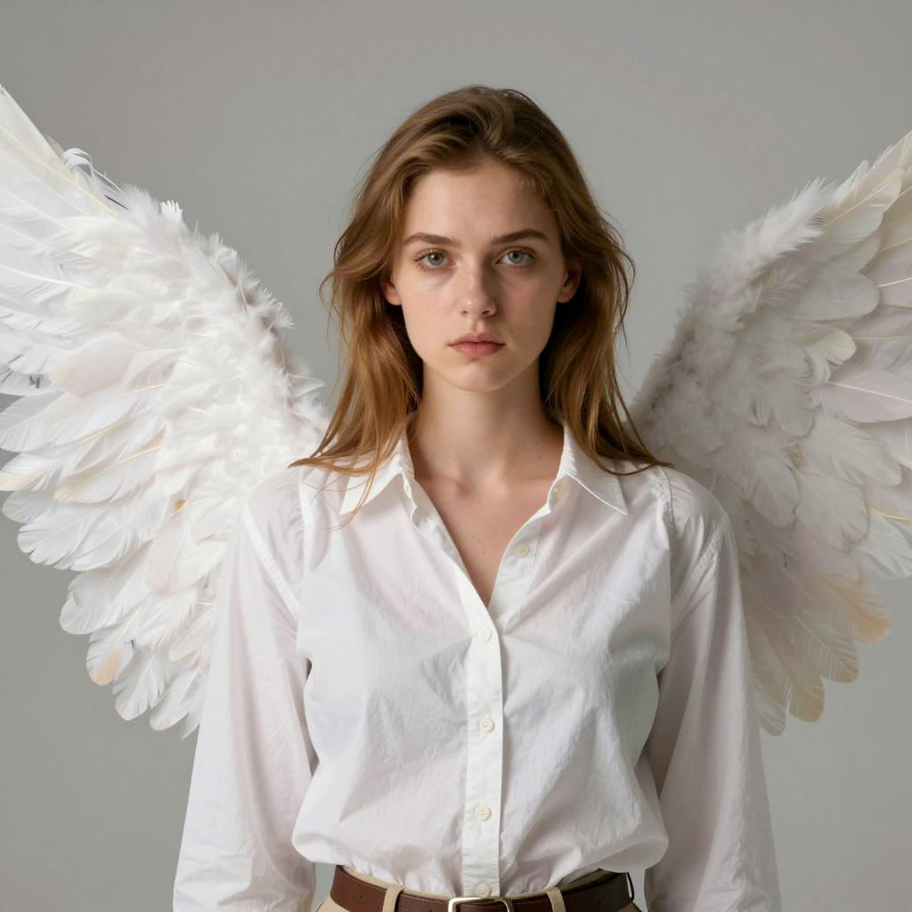 Grey angel costume, digital painting, angelic teenage girl, realistic style, full body, silver halo above head, large white feathered wings, grey hooded robe, serious expression, blue eyes, short dark brown hair, soft sunlight, outdoor background, blurred trees and brown ground, autumn colors, calm and serene mood, detailed feathers, subtle shadows, soft fabric ure, ethereal and mystical atmosphere