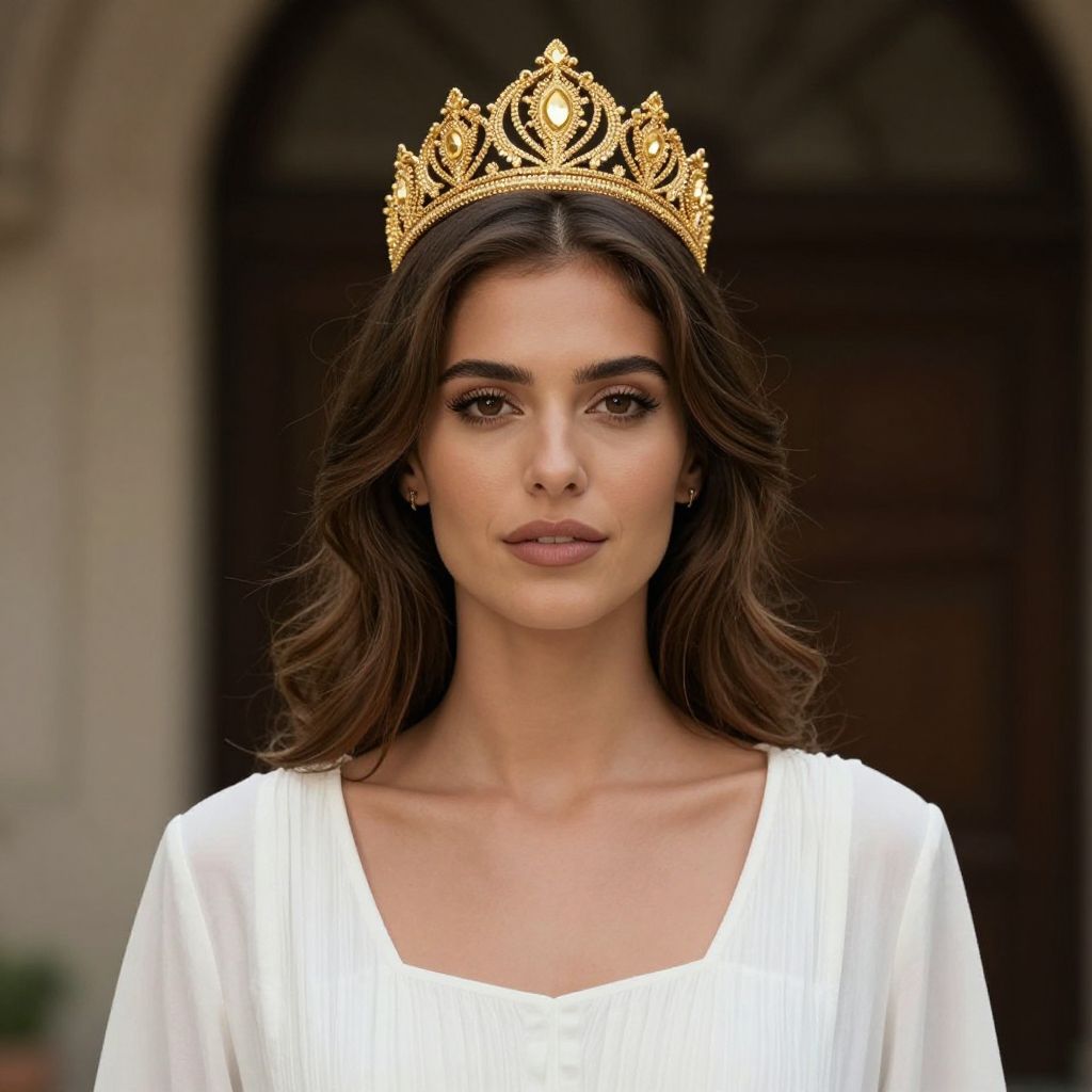 Greek fancy dress outfit, a close up of a woman in a white dress and gold crown