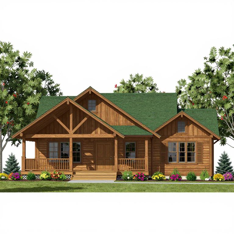 Front elevation plan #932-203 showcases a rustic country home with a warm wooden exterior, featuring a prominent porch supported by sturdy columns, a green roof, and vibrant landscaping including flowering shrubs and evergreen trees surrounding the property.