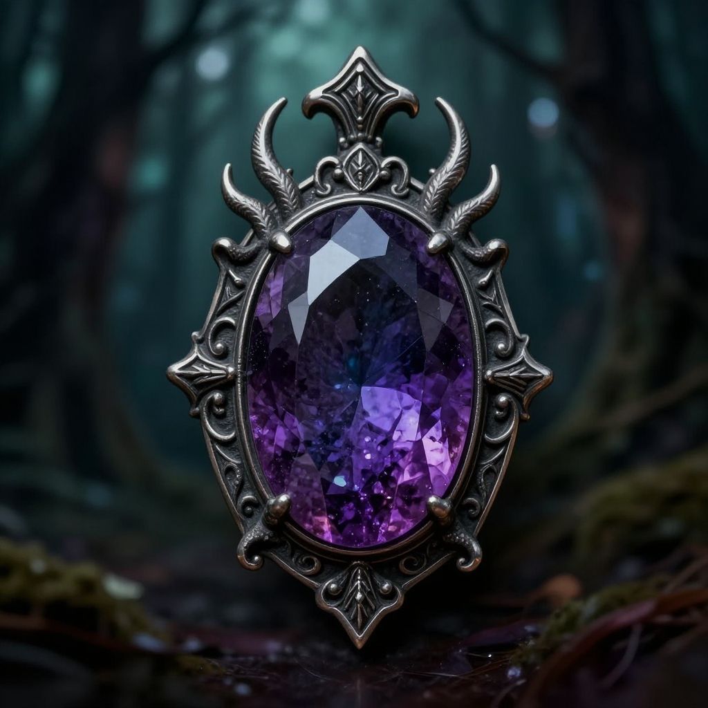 A digital artwork features an ornate silver pendant with an oval, faceted purple gemstone. The gemstone, with a gradient of deep violet to bright purple, reflects light, creating a sparkling effect. The pendant is intricately designed with wing-like motifs and a small fleur-de-lis at the top. The background is a dark, mystical forest with blurred, shadowy trees and a misty atmosphere, enhancing the pendant's ethereal quality. The overall style is fantasy-themed, with a focus on magical and mysterious elements.