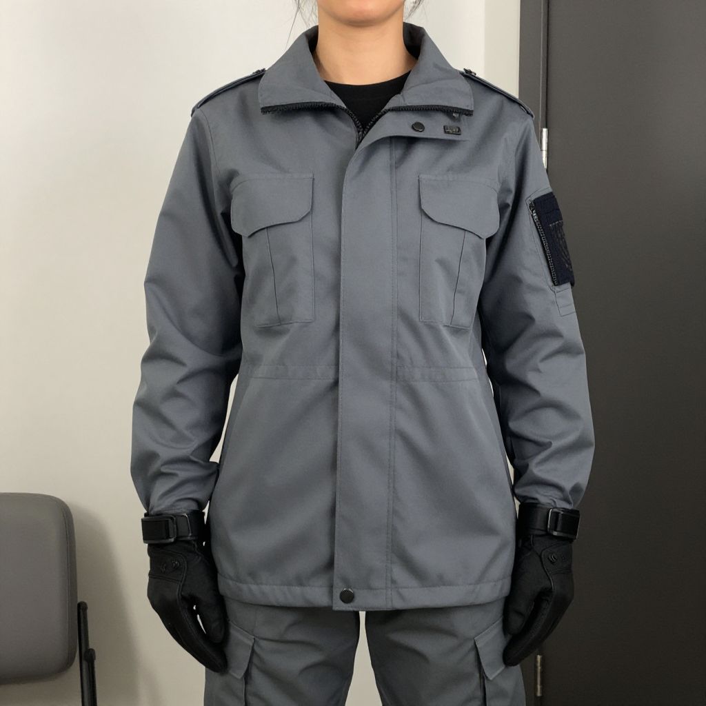 Photograph of a faceless person wearing a gray police uniform with black gloves, patches on sleeves, and cargo pants, standing in a plain room.