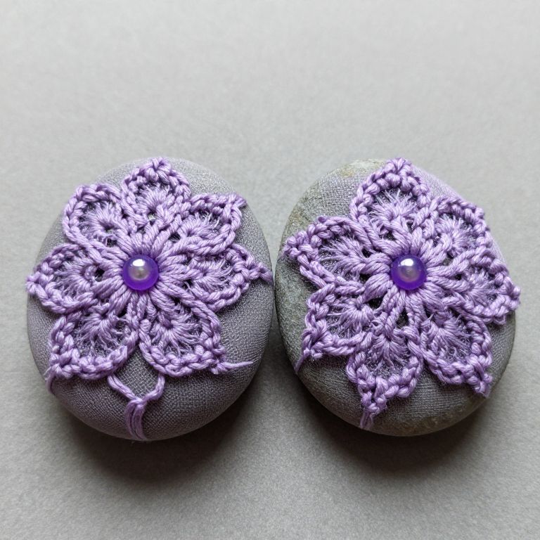 Photograph of two round, textured gray buttons adorned with intricate, purple crochet flowers and central pearls, placed side by side on a white, textured surface