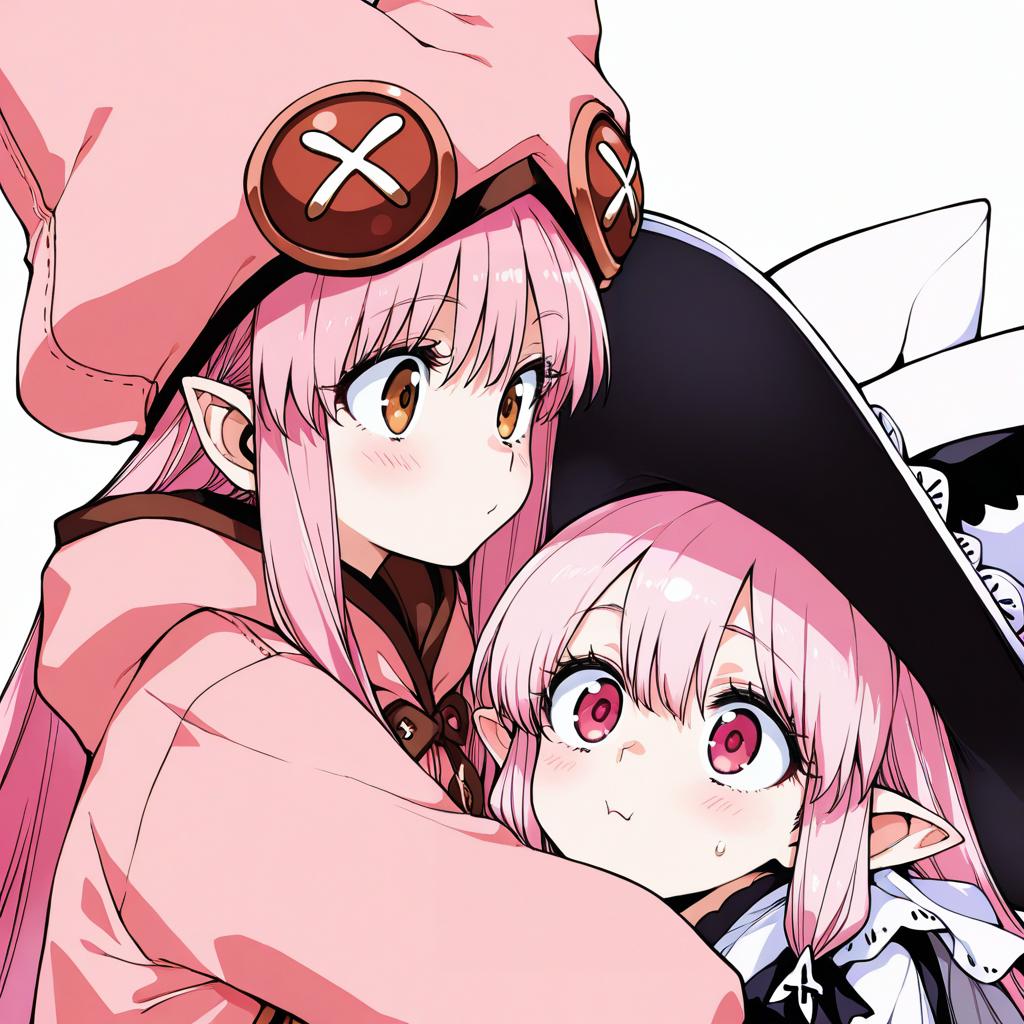 Digital illustration of two anime girls with pointy ears and pink hair. The girl on the left wears a large pink hat with brown buttons featuring white X marks and a matching pink outfit. The girl on the right has pink eyes and light pink hair, wearing a black wide-brimmed hat adorned with a white bow and a black and white outfit. Both characters have expressive eyes and blushing cheeks, set against a plain white background.