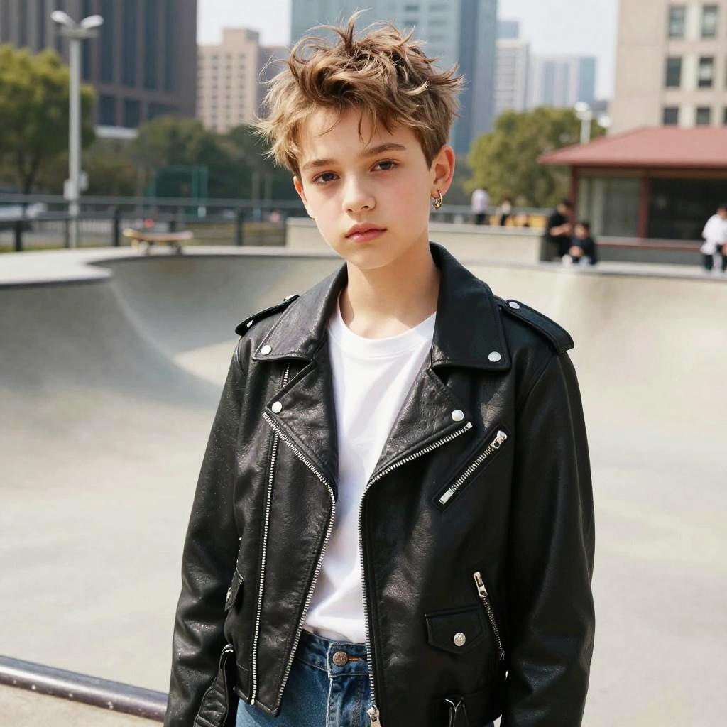 Textured Crop hairstyle on teen girl, wearing vintage leather biker jacket, in city skate park, captured in fashion editorial style with bright cool daylight.