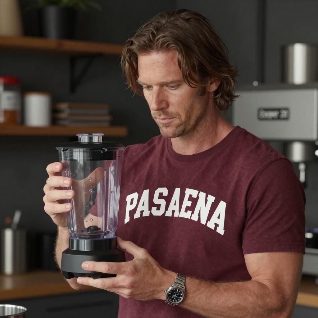 A man with medium-length brown hair and a maroon shirt with "PASadena" in white letters holds a transparent blender-like device. He has a focused expression. Background includes shelves with various objects, an industrial-looking machine labeled "Cooper 20," and dim lighting. He wears a silver watch on his left wrist.