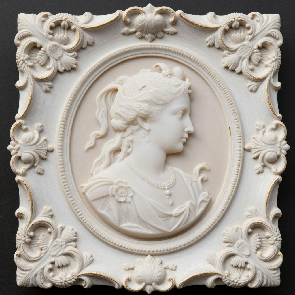 Elegant cameo relief sculpture set within an intricately carved, baroque-style frame featuring floral and foliate motifs, showcasing a classical portrait of a woman with flowing hair and delicate jewelry.