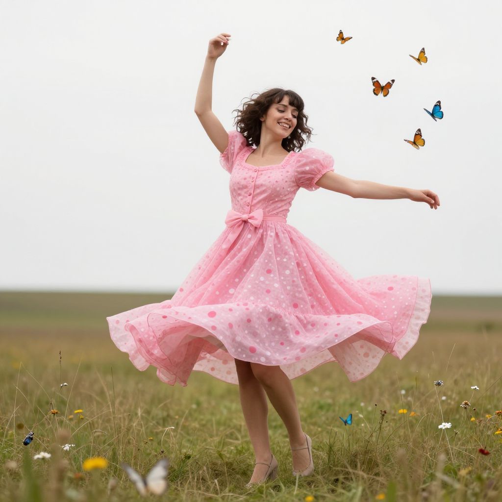 A joyful woman in a whimsical pink polka dot dress dances in a field, surrounded by fluttering butterflies, capturing a moment of carefree happiness and a touch of artistic creativity.