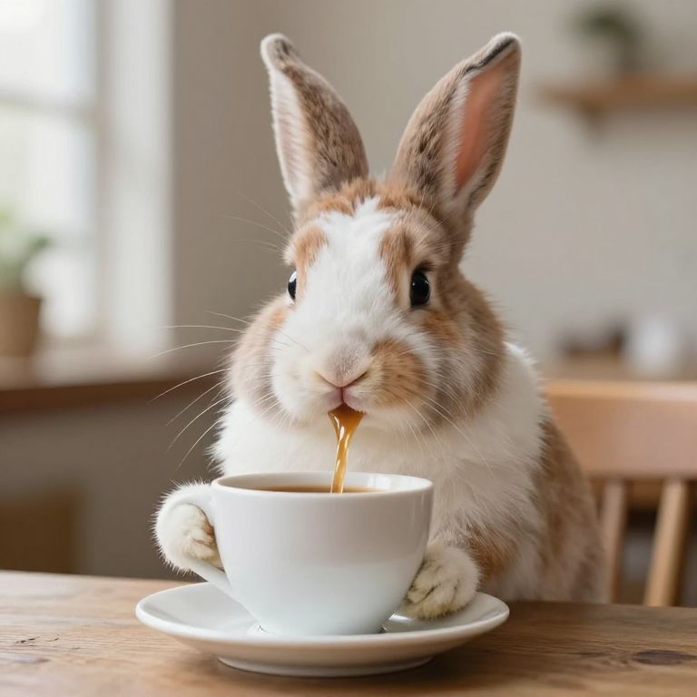 Photograph of a brown and white rabbit with large ears, drinking from a white cup on a wooden table, in a softly lit, blurred kitchen background