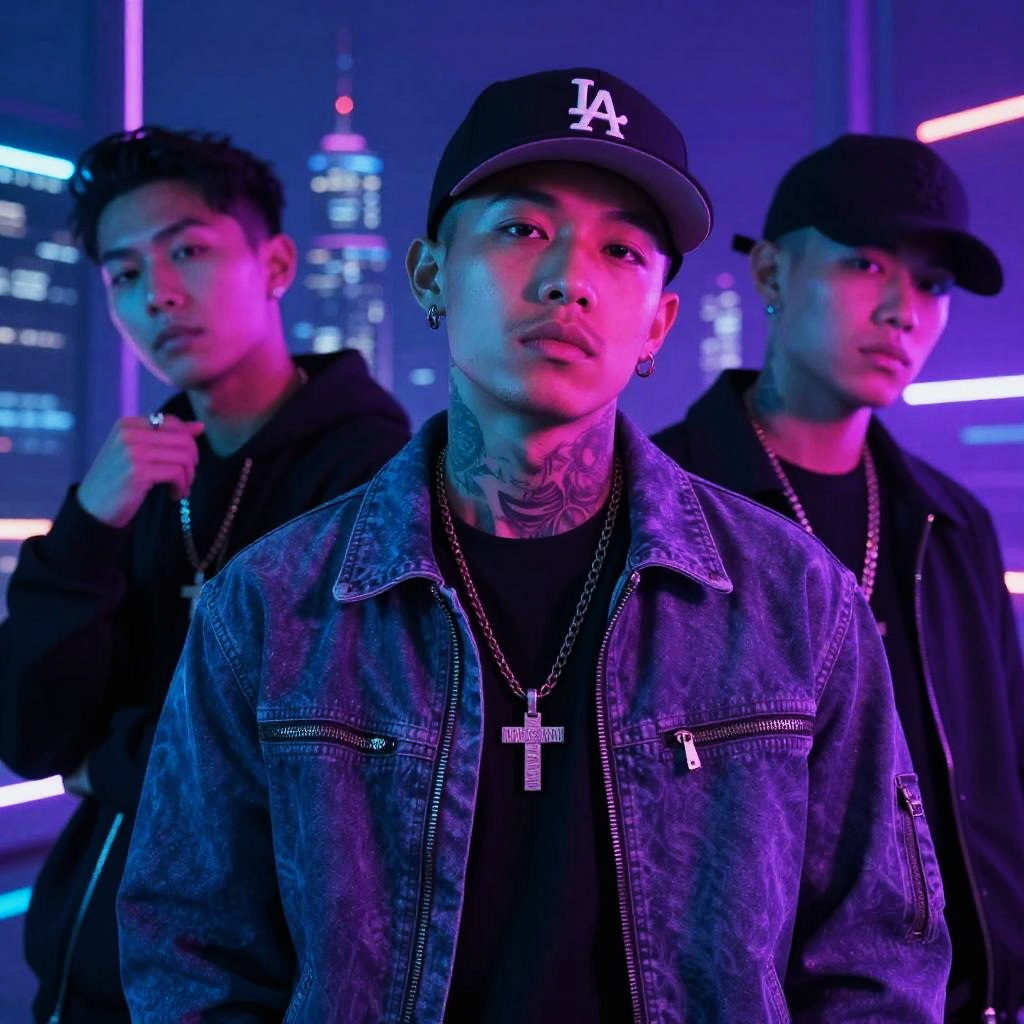 Cools urban street scene at twilight, featuring vibrant graffiti walls, stylish young people in modern streetwear, neon signs glowing softly, dynamic energy and a sense of cool sophistication, cinematic lighting, high detail.