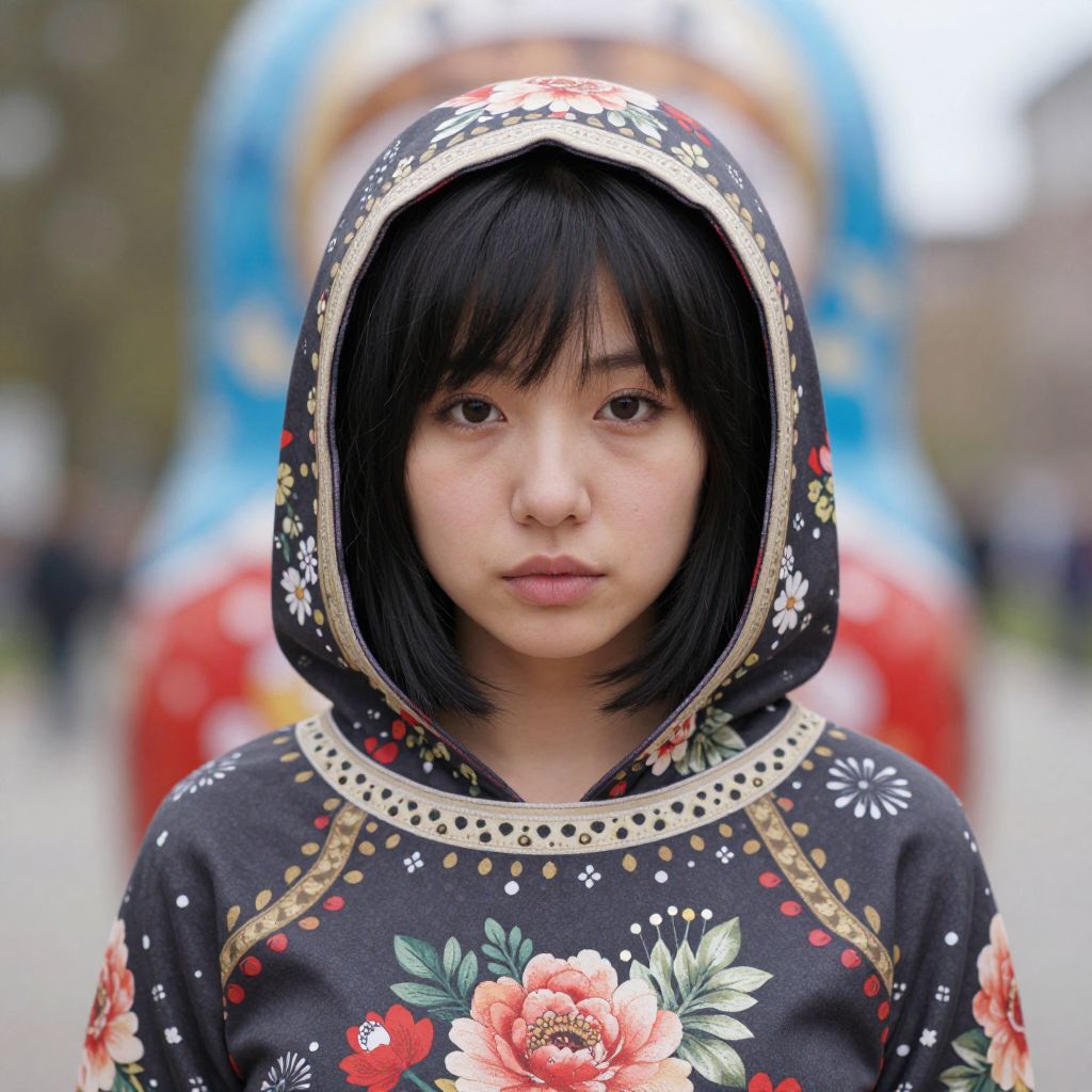 Photograph of an East Asian woman with straight, black shoulder-length hair, wearing a black floral-patterned hoodie with a white and red flower design. The hoodie has a beige, beaded trim around the hood and neckline. She has fair skin and a neutral expression, with slightly parted lips and dark eyes. The background is blurred but shows a large, blue and red figure, possibly a statue, and some indistinct people and trees. The overall color palette includes black, red, white, and green from the floral patterns. The image has a shallow depth of field, focusing on the woman's face.