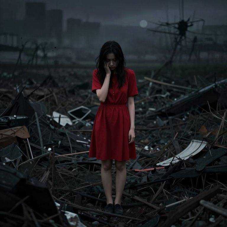 Photograph of a young woman with long, wet, dark hair standing in a desolate, post-apocalyptic landscape. She wears a vibrant red, short-sleeved, knee-length dress and black shoes. Her right hand touches her hair, and she gazes downward with a somber expression. The background is a dark, debris-filled field with twisted metal and broken objects scattered around. The sky is overcast, with a faint, distant cityscape and a small, glowing orb in the horizon. The overall color palette is dark and moody, with deep blues and blacks contrasting with her bright red dress.