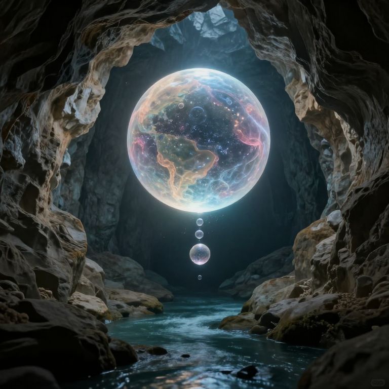 Suspended between the ethereal glow of otherworldly spheres and the rugged embrace of ancient stone, a subterranean river whispers secrets of infinite possibility, where the weightless bubbles cradle miniature worlds, inviting contemplation of the delicate balance between the tangible and the imagined.