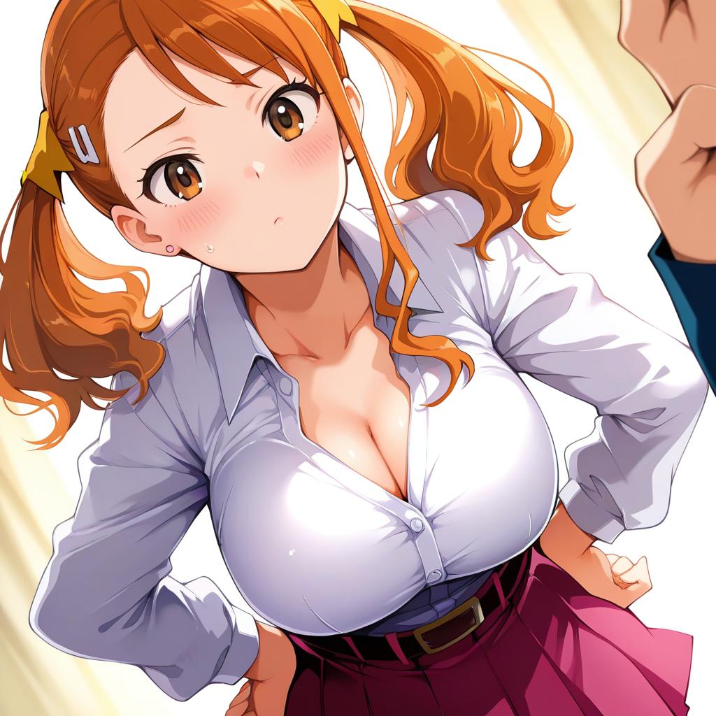 Anjou naruko, ano hi mita hana no namae wo bokutachi wa mada shiranai., 1girl, brown eyes, brown hair, long hair, orange hair, twintails, large breasts, by artist azuma aya, illustrious