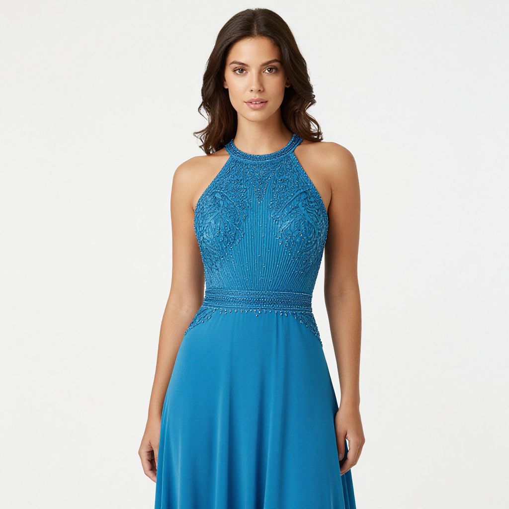 "Woman, formal evening wear, floor-length gown in a bright blue hue, halter neckline with intricate beadwork and embroidery on the bodice, sleeveless, defined waistline accented with beaded detail, smooth flowing skirt, white background.. Sexy. Pretty face and beаutiful eyes. Big breasts."