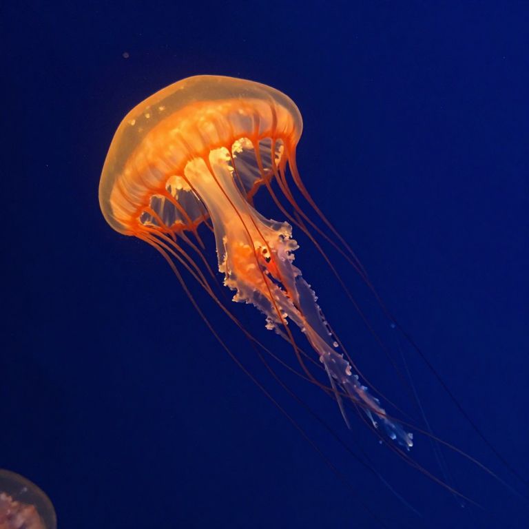 Illuminated jellyfish gracefully drift through the deep blue ocean, their translucent bodies glowing with vibrant orange hues as they float near a radiant light source, casting intricate patterns of light and shadow.