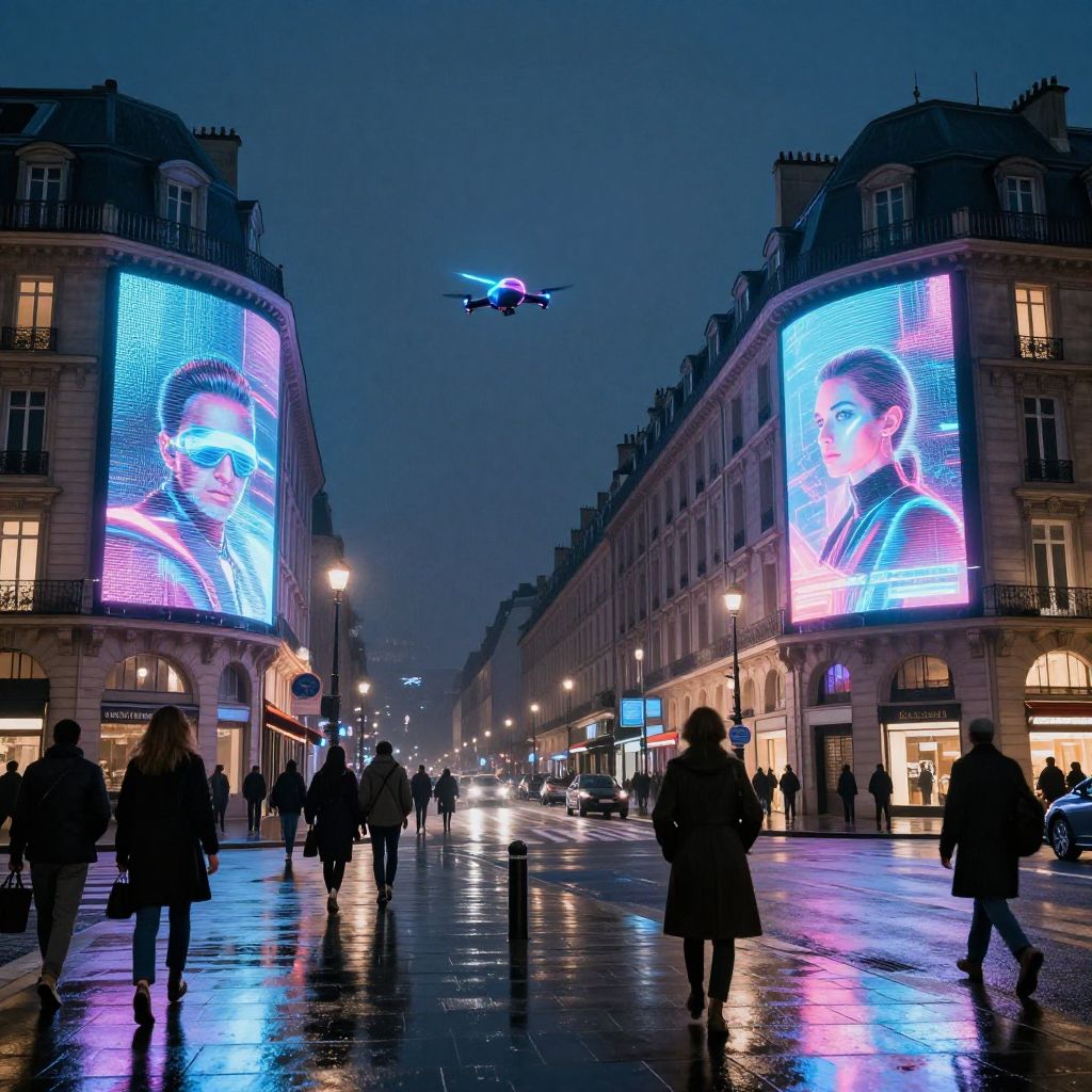 Futuristic Paris street scene, holographic advertisements glowing on classic Haussmann buildings, pedestrians in high-tech fashion, drones hovering softly overhead, rainy night