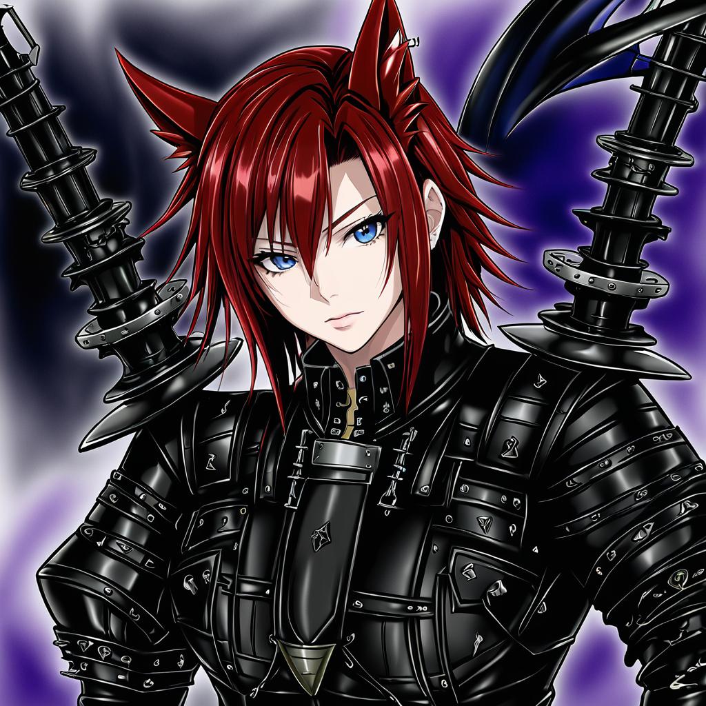 Digital anime-style illustration of a female warrior character with striking red hair, blue eyes, and cat-like ears. She is dressed in elaborate black armor with metallic details and is carrying dual weapons on her back. The background features a blurred dark blue and black gradient, emphasizing the character's fierce expression and design.